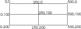 Een korte uitleg is misschien wel op z'n plaats. Het plaatje heeft een afmeting van 500x200 pixels. Anders dan gebruikelijk staat de oorsprong (0,0) linksboven. De rechteronderhoek heeft dus als coördinaten 500,200.Als we het plaatje in vier gelijke vlakken verdelen worden dit de coördinaten: