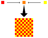 Hier zie je wat er gebeurt als er een oranje kleur weergegeven moet worden: Zoals je wellicht uit je vingerverf-periode weet, kun je oranje maken door rood en geel met elkaar te mengen. Dat gebeurt hier ook. Door rode en gele pixels door elkaar te laten mengen, zie je oranje.